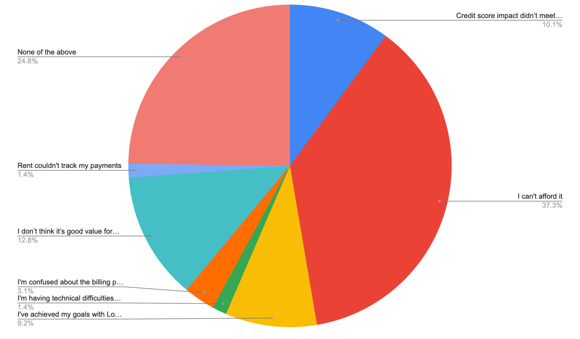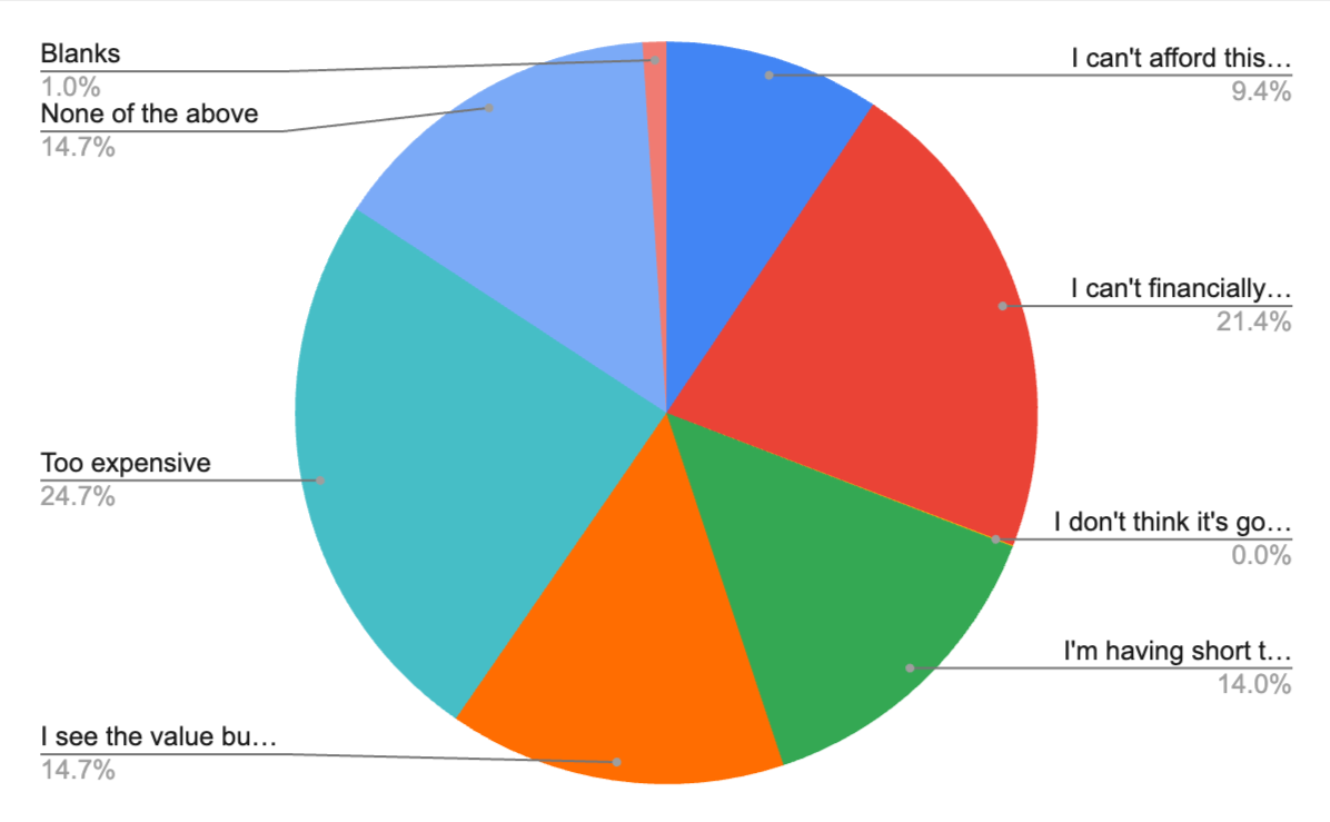 Working with the lead developer, I pulled exit survey data and found that affordability issues were the top reason for cancellation. Looking deeper into the sub reasons gave us a clearer picture of what “can’t afford it” really meant: